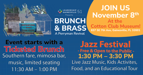 Leadership Gainesville Class 51 is proud to partner with The Cotton Club Museum and Cultural Center to host a unique fundraiser that blends rich cultural heritage with vibrant local music. We invite you to be a part of Brunch and Brass, a community celebration designed to help raise $200,000 for the renovation of the historic Perryman Building- a former grocery store and community anchor in the heart of Gainesville.